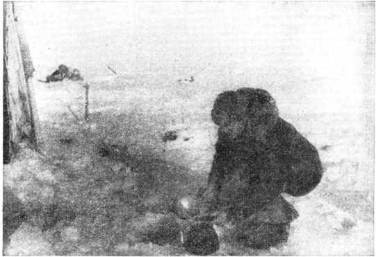 Вода на льдине дает лишь одно облегчение: не надо растапливать снег для еды. (Э. Т. Кренкель набирает воду для чая.)