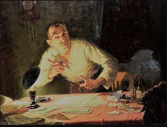 На столе слева лежат обрывки черновика, стоит четвертинка водки с сургучной головкой, стакан и надорванная пачка «Беломорканала». Пишет кляузник ручкой-вставочкой (чернильница стоит под его рукой). В Сети растиражирован вариант картины, где кляузник — левша. Не могу понять, кроется ли в этом какой-то символизм, но тут я выбрал вариант, где персонаж держит своё приравненное к штыку обычным образом.