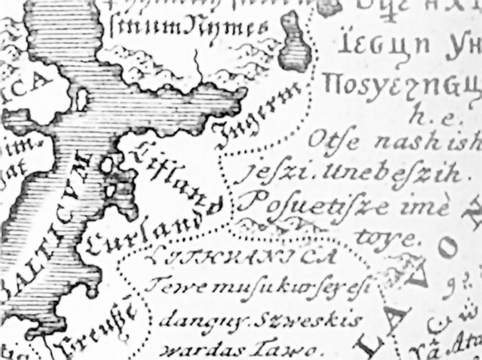 Карта европейских языков (1741 г.) с первыми строками Отче наш на литовском.