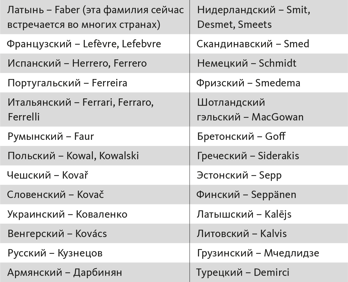 Одна из самых распространенных английских фамилий Smith широко используется далеко за пределами Британии – фамилии с тем же значением типичны для всей Европы. Всех обошел румынский скульптор Ион Шмидт-Фаур: его фамилия переводится как Кузнец-Кузнец. Ниже приведен – далеко не полный – список европейских кузнецов: