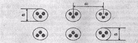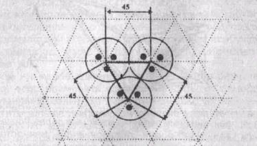 А ведь это же равносторонний треугольник, стороны которого составляют два радиуса тех кругов, которые проецируются на землю кустами. Дальше совсем просто: под кусты картофеля мне требуется кружок земли диаметром 45—50 см под кусты зерновых — 16—17 см.