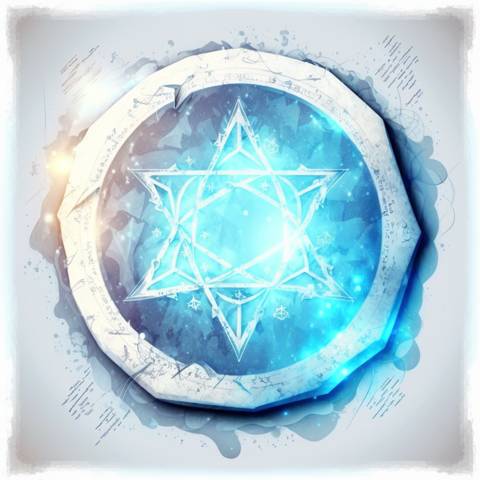 Шестиконечная звезда с несколькими вписанными внутрь неё кругами, формирующими что-то вроде узора снежинки, а вокруг — широкий пояс из белоснежного, рваного овала с десятками рун.