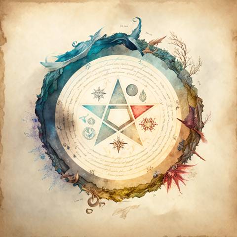 В центре разноцветного круга, заключенные цепями рунической вязи, покоились пять треугольников, под основаниями которых лежал пятиугольник, направленный вниз. Если присмотреться, то он действительно напоминал собой щит. А еще каждый луч имел цвет собственной стихии, на символ которой указывал. Земля, вода, огонь, воздух и энергия Лей. Элементы, из которых, по мнению автора учебника, формировалось все сущее.