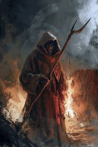 — Выходи, ведьма! — грозно заявляет некто, по виду похожий на служителя культа. Его отличает от остальных причудливое, обильно украшенное одеяние типа мантии и некий символический жезл в руках. Вряд ли кто-то стал бы так наряжаться от нечего делать, скорее всего, это шаман при исполнении.