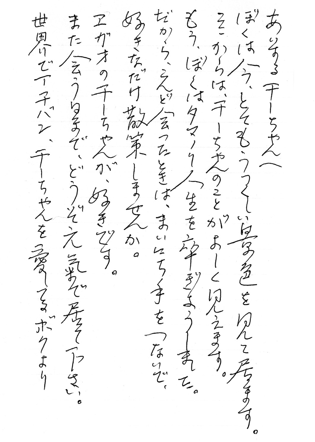 Ну, а это письмо из рая. То есть из прекрасного цветочного сада. Кому-то, возможно, такая аллегория покажется слишком наивной. Но если бы отец Сэйтаро и правда писал из рая, разве его письмо не выглядело бы точно так же?