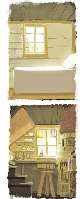 Дом внутри оказался вполне удобным. Да, очень, очень узким, но из-за того, что одну стену, от пола до потолка, занимала картина, изображавшая лесную чащу, комната выглядела шире, чем на самом деле. За раздвижной дверью скрывалась кухня. Тоже крохотная, и всё же в ней уместилась компактная печка, маленькая мойка и прибитая к стене широкая полка, которая при необходимости могла быть как разделочной доской, так и обеденным столом – не зря же под ней стоял высокий табурет. Все остальные стены, кроме одной, с окном, откуда открывался вид на соседнюю улицу, занимали полочки, а на них в идеальнейшем порядке стояли баночки и мешочки с продуктами, посуда и прочая кухонная утварь.