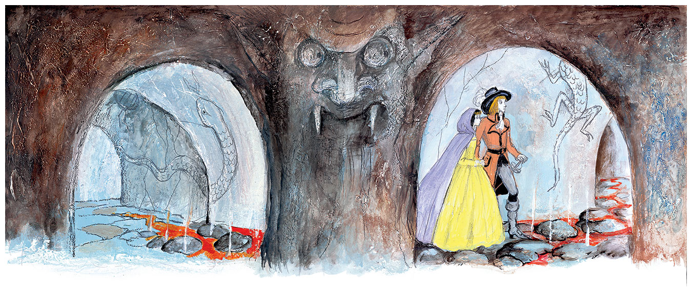 – Шапка-невидимка, моё сокровище, – усмехаясь, прошептала королева Морганда. – Сегодня ты мне пригодишься. Белоснежка и принц Теодор отыщут пещеру Подземного Властелина. Но они не знают, что это пещера Ужасов! Ни один смертный не может пройти пещеру Ужасов и не испугаться. Но горе тому, кто испугается и задрожит от страха! Горе и верная погибель! Потому что по знаку Подземного Властелина на него прольётся огненный дождь и спалит его дотла. Я хочу увидеть своими глазами, как огненный дождь сожжёт Белоснежку и принца Теодора. Мне-то нечего опасаться. Ведь я буду в шапке-невидимке. Подземные ужасы, населяющие пещеру, не смогут меня заметить…