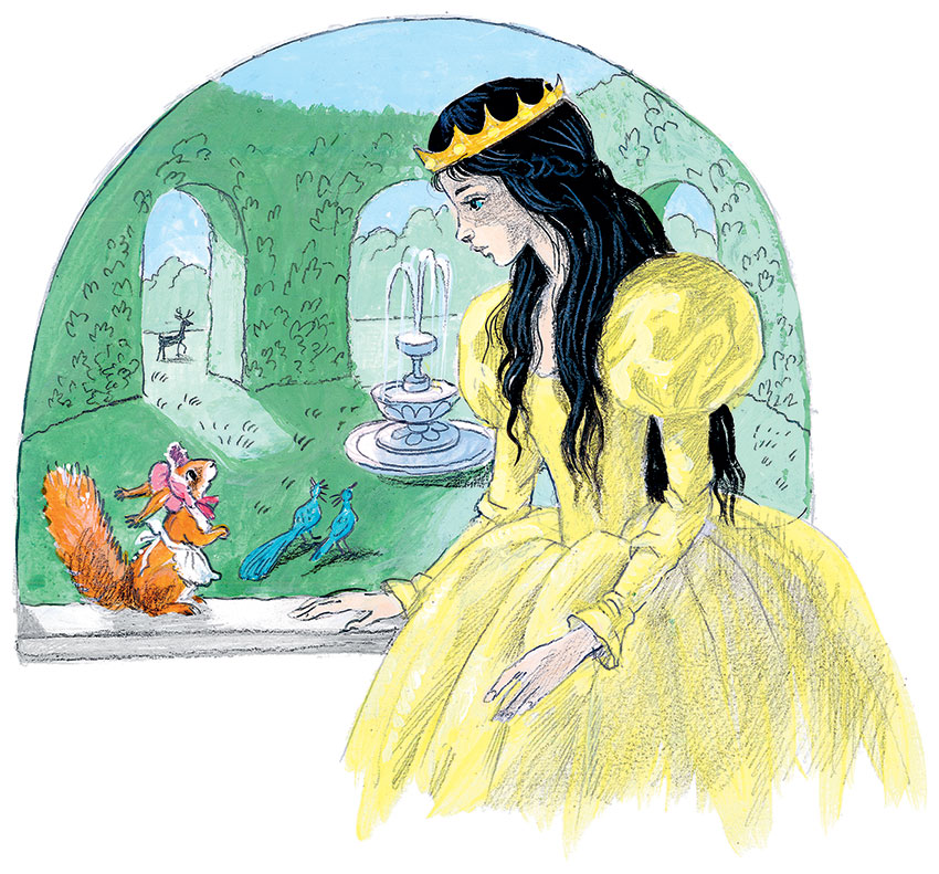 Едва она коснулась крылом ковра, как тут же превратилась в придворную даму в пышном шёлковом платье.