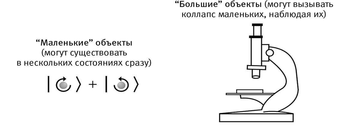 Ответ Бора состоял в том, что объекты во вселенной делятся на два типа: «маленькие» вроде атомов и электронов, которые могут существовать в нескольких местах одновременно (или делать сразу много всего), и «большие», которые умеют вызывать коллапс этих «маленьких» объектов в одно из множества их состояний, когда бы крупные объекты ни использовались для «наблюдения» мелких.