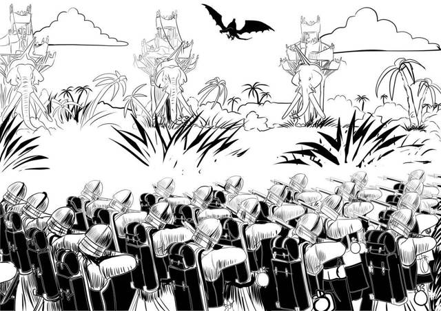 Под вечер. А утром — жутковатое шоу. Остатки войск местного правителя вывалили из джунглей и отошли в город. Потрепанные. Измученные. Изнуренные. Сообщив, что враг идет по пятам.