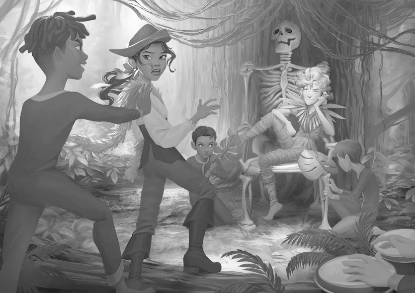 Аладдин затащил ее внутрь статуи Пэна. Листья, необычно мягкие и шелковистые, успокаивающе шелестели. Они шли в тишине и полутьме. Аладдин зажег магический свет на кончике пальца и увидел Крюка, прижимавшего палец к губам. Джеймс сидел в углу, на одной из верхних ступенек высокой извилистой лестницы, выдолбленной из внутренностей древесного ствола. Аладдин и Кима присели рядом с ним и посмотрели через перила вниз.