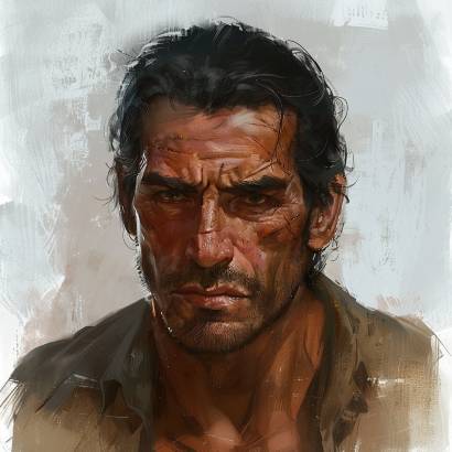 Смуглая кожа его лица, обветренная и покрытая сетью мелких морщин, свидетельствует о десятилетиях, проведённых под палящим солнцем. Грубые черты лица с резко очерченными скулами и тяжёлой квадратной челюстью придают ему одновременно суровый и отчуждённый вид.