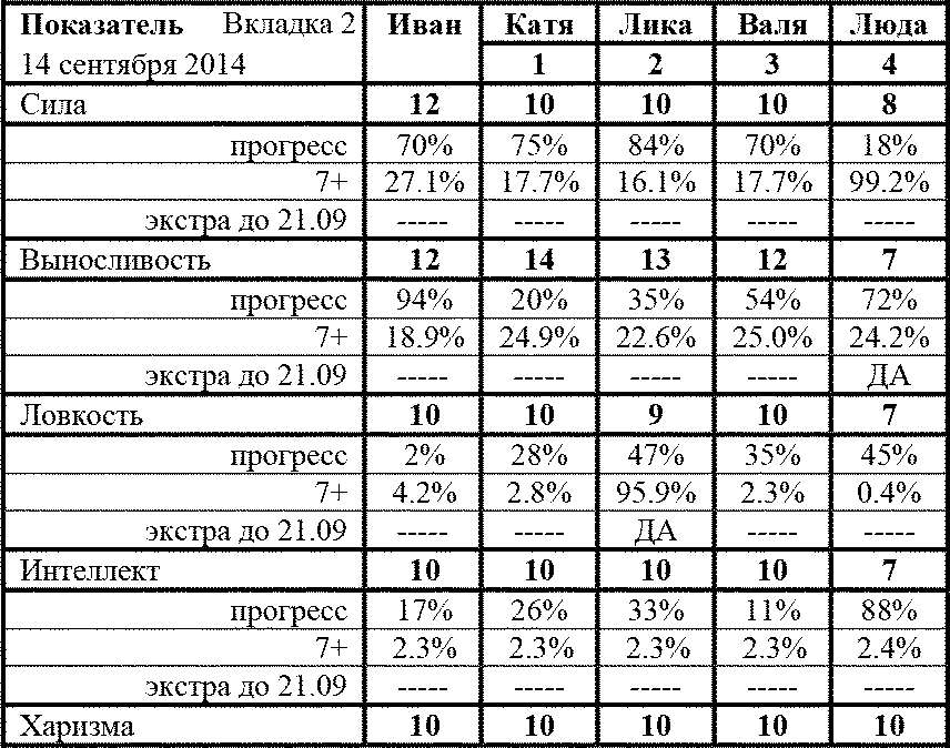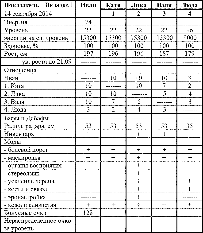 Вечером, отдохнув после фарма, мы распределили Энергию. Как и на прошлой неделе, я поднял Уровни Лике и Люде, Энергия 74 (-14 100, -8 100). Аналитику я вложил Очко снова в Ловкость, а хилерше в Выносливость. Люда, "погуляв" сегодня по тайге, очень настаивала именно на этом Параметре, прекрасно увидев, как сильно тормозит наше перемещение.