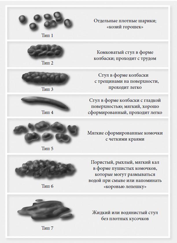 Чтобы установить наличие запора или диареи, принимаются во внимание качество, частота и объем стула. Чтобы оценить качество стула и помочь вам понять, что происходит у вас в туалете, некоторые врачи используют Бристольскую шкалу формы кала, названную так в честь Бристольского университета в Англии, где в конце 1990-х годов работал врач, разработавший эту шкалу, – доктор Кен Хитон. Бристольская шкала представляет собой иллюстрированную шкалу стула, охватывающую весь спектр человеческих испражнений: от сильного запора, твердых шариков (которые я часто называю козьим горошком) до жидкой, водянистой диареи, а также всех возможных промежуточных вариантов. Впервые она была опубликована в книге доктора Хитона Understanding Your Bowels, изданной в 1999 году в Великобритании издательством Family Doctor Publications.
