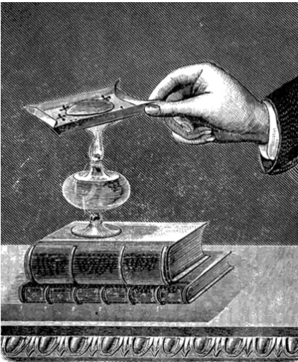 Можно олово или свинец расплавить на игральной карте с загнутыми краями (рис. 12) или в крепкой коробке, выдавленной из целого куска картона. Карта или коробка не успевает сгореть, потому что вся теплота, которую она получает, отнимается оловом; надо только нагревать карту как раз под самым металлом; если же огонь попадёт в такое место, над которым олова нет, то, разумеется, папка загорится.