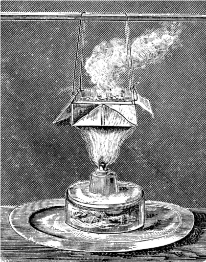 Теперь вооружимся хорошим термометром и опустим его в воду. Удивительное явление! Сколько мы ни нагреваем колбу, температура остаётся та же – 100 °C. А вода всё кипит и кипит, всё меньше и меньше становится её в колбе… Если мы поднимем термометр так, чтобы он не касался воды, а стоял в горлышке, в водяном паре, то и здесь он не изменит своих показаний: ртуть будет стоять всё на 100 °C… Неужели же наша лампа более не греет? Куда девается её тепло? Тепло затрачивается на превращение воды в пар. Оно, как говорят, переходит в скрытое состояние. Водяной пар набирает тепло и, поглощая, сохраняет. Когда же, наоборот, мы пар охладим и он превратится в воду, скрытая теплота опять станет явной. Поэтому паром можно пользоваться для нагревания. На этом и основано бывшее ранее в широком ходу паровое отопление. В подвальном этаже устраивают печь и в неё вмазывают большой котёл. От этого котла проводят трубы по всему дому. Котёл наполняют водой. Вода обращается в пар. Пар расходится по трубам, сгущается здесь в воду, отдаёт им своё скрытое тепло; трубы нагреваются и нагревают окружающий их воздух.