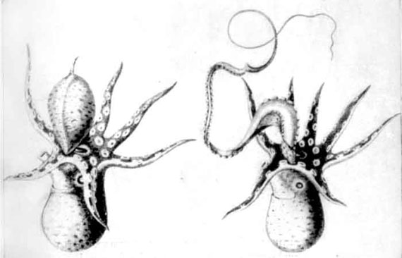 Осьминоги аргонавты. Вверху: Самка в выводковой раковине, наполненной яйцами. Внизу: две стадии развития полового щупальца самца.