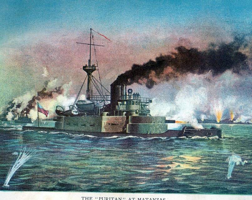 Монитор «Пуританин» стреляет из своих башенных 12-ти дюймовых пушек по испанцам…