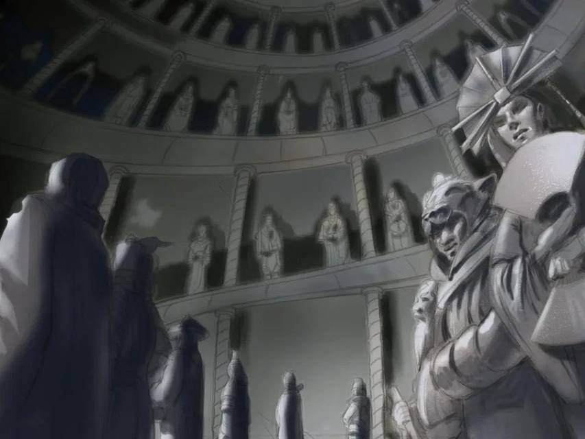 Двухчасовой спуск вниз, который своей продолжительностью удивил несомненно совершено всех, привёл нас в большой, просто огромный по площади зал, что был свободен от мёда ос-стервятников, которым мы успели провонять. Но дар речи капитан и его отряд потеряли не из-за долгого спуска вниз или огромного зала. Нет. Дело было в строении этого самого зала. Даже деревенщине станет понятно, что это место было сотворено руками человека. Слишком ровные стены и пол. А ещё статуи. Множество статуй совершено разных людей, что спирально расположены прямо по центру зала.