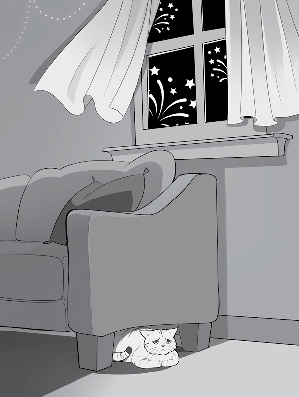 Подготовьтесь к таким праздникам заранее. Найдите в своем доме тихое и спокойное место для кошки, это может быть дальний угол в вашем платяном шкафу, чистое местечко под ванной или на кухне, возможно, вы сможете выделить питомцу самую дальнюю и тихую комнату в своем доме. Постелите там для котика небольшое одеялко (лучше всего то, на котором котик предпочитает отдыхать в обычное время), недалеко поставьте аромадиффузор с двумя каплями масла лаванды, включите ему тихую, спокойную музыку. Ваша задача сделать небольшую лаундж-зону, где, несмотря на весь шум и гам, будет место, в котором котик сможет расслабиться и отдохнуть. В самый разгар праздника, когда залпы салютов слышны из-за каждого угла, просто посидите с котиком рядом, покажите ему своим примером, что ничего страшного не происходит и что вы не переживаете и готовы быть ему опорой. Не стоит сильно сжимать в этот момент питомца или чрезмерно наглаживать. Если хотите прикоснуться к животному, делайте это аккуратно и плавно, без резких движений. Говорите с ним тихим, спокойным, убаюкивающим голосом. Не переживайте, если котик не притронется к еде в это время. Так работает его нервная система во время стресса. Как только грохот и резкий шум закончатся, питомец обязательно вспомнит, что его ждет вкусная мисочка с едой.