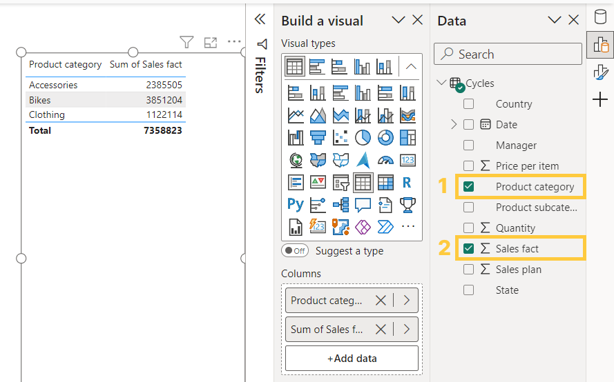 Если поле, которое вы выбрали первым, имеет числовой тип, то Power BI в стандратной версии всегда строит на нем столбчатую диаграмму. В интерфейсе с применением объекто-ориентированного меню первым появится визуальный элемент типа карточка, представляющий сумму значений выбранного поля, а при добавлении категорий он изменится на линейчатую диаграмму. Но это все просто предложение от Power BI, и мы всегда можем изменить тип диаграммы вручную или пойти другим путем: сначала выбрать тип диаграммы, и потом наполнять его нужными полями. Сейчас мы с этим поработаем.
