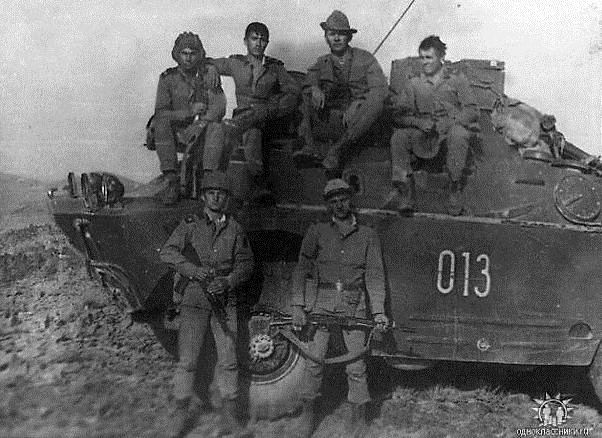 БРДМ-2, 1-й дивизион 2-я батарея взвод управления. Стоят: ком. отделения связи мл. с-т Третьяков? ряд. Ермишин Е. Д. На броне: ст. разведчик ряд. Мухаммедов Аннадурды Клычьевич, водитель ряд. Сабур? КВУ л-т Пятаев Николай Николаевич, дальномерщик ряд. Павлов В.М.
