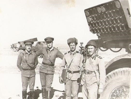 Вторая батарея 1-го дивизиона. Слева направо: командир второго взвода л-т Севостьянов Александр, старший офицер батареи ст. л-т Глазов Альберт, командир БМ-21 с-т Ванюкевич Владимир, наводчик мл. с-т Шерназаров Бахтияр (из личного архива Виктора Павлова)