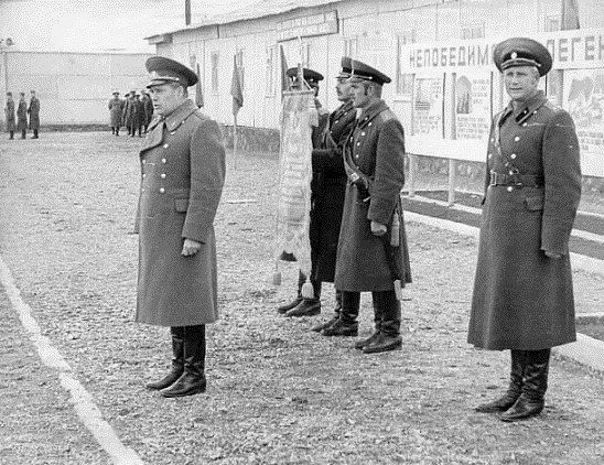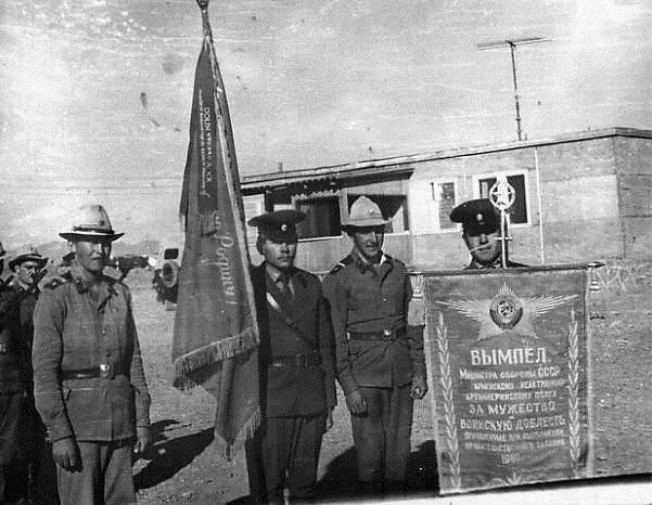 Вручение Вымпела, на трибуне 1-й ряд, слева направо: начальник политуправления ТуркВО генерал-лейтенант Родин В.С., командующий ТуркВО генерал-полковник Максимов Ю.П., командир полка подполковник Кулешов Е.Г., начальнике политотдела 5-й мсд полковник Павличенко В.К.; 2-й ряд слева направо: заместитель командующего войсками ТуркВО по тылу генерал-лейтенант Шудра Н. А., заместитель командира по политической части 3-го дивизиона капитан Корецкий М.Г.