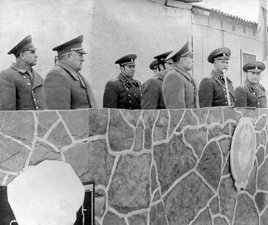 Прохождение торжественным маршем (слева направо): зам. командира полка майор Бут И.Н., начальник штаба майор Ильин Б.М., зам. командира по вооружению подполковник Куралев Л.М. Перед Вымпелом - заместитель начальника штаба полка майор Зимин Н.К. Слева от трибуны - командир полка подполковник Кулешов Е.Г. (из личного архива Виктора Спирина)