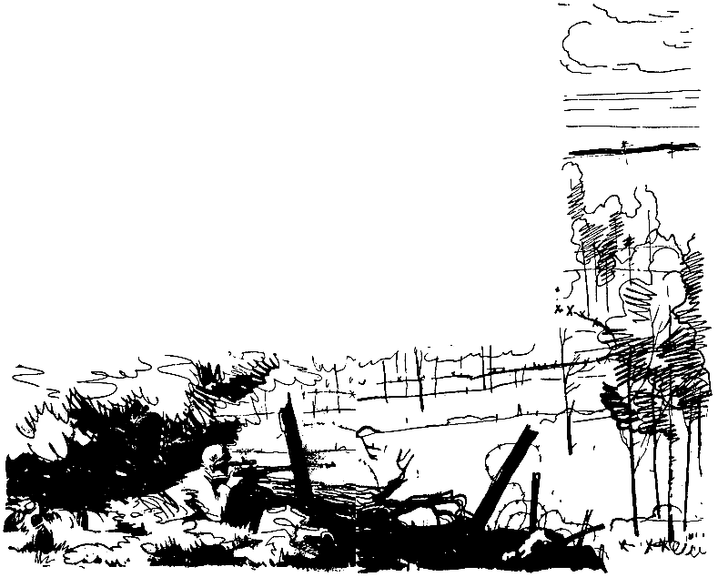 И вот, как мазок сажи на нежной акварели рисунка, там на вражеской стороне, позади бывшей берёзовой рощи, появляется фигура человека в серо-зелёном мундире. Он идёт крадучись, стараясь не поднимать головы над краем неглубокого окопа.
