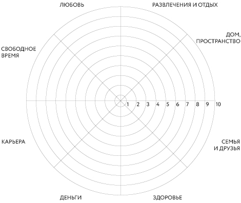 Проставьте оценку от 1 до 10 каждой из обозначенных сфер. Закрасьте соответствующее количество делений в каждой из них.