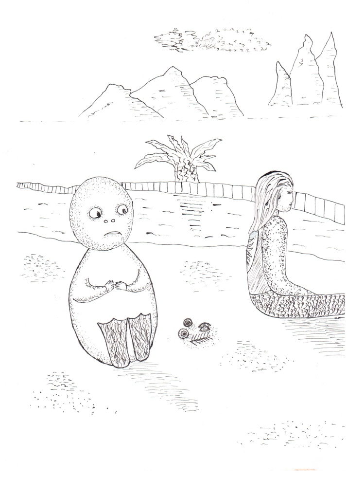 В воде резвились маленькие человечки без бровей. Они замерли от удивления, как только друзья появились, по-видимому, впервые так близко увидев человека.