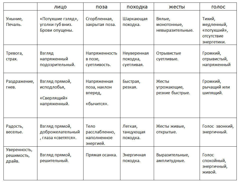 Ниже дана таблица симптомов, которая позволит вам эффективней вести диагностику эмоций вашего собеседника. Как определить, что: