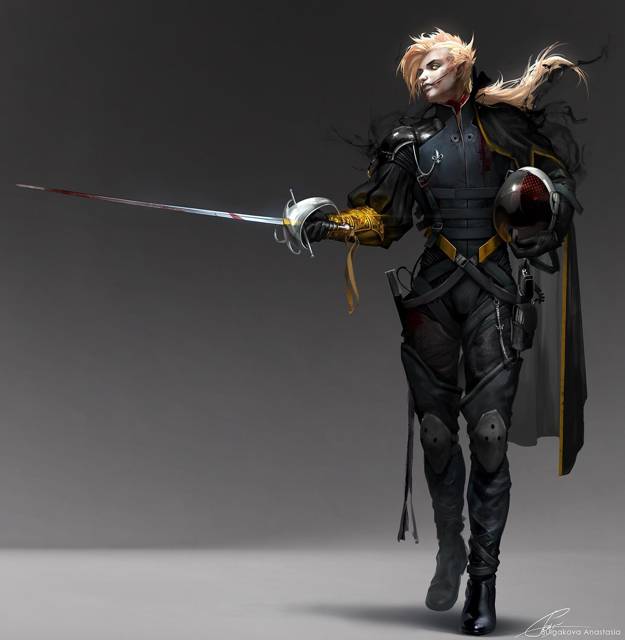 Рядом — смазливый блондинчик[1] из расы Льфёсальфар. Весь из себя пижон. Чёлка вихрами и коса аж до задницы. Бледная, восковая кожа. Чёрная щегольская одежда с иголочки, у бедра ножны с длинным узким клинком — что-то вроде рапиры. Фираз «Багряный Вихрь» Халлан.