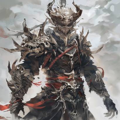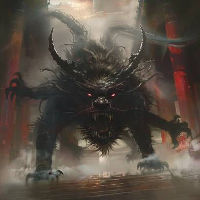 Демон, а иначе эту тварь не назовёшь, облачён в одеяние, сотканное из мрака, чем-то схожее с доспехами императорских Теней. Вот уж ублюдочное родство! Маска будто срослась с уродливой мордой, на которой застыла хищная ухмылка, обнажающая частокол мелких зубов. Со лба вверх вздымаются два кривых чёрных рога. С затылка свисают косы, сплетённые из чёрных с проседью волос, а за спиной стелется шлейф хлыстов, утыканных лезвиями.