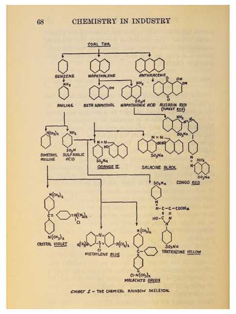 Недра земли дают нам уголь — вещество, далекое от цвета настолько, насколько далека может быть от него чернота. Тем не менее под воздействием тепла в закрытом сосуде из угля, кроме всего прочего, получают легкие масла (бензолы) и смолу <…> — основное сырье для производства красителей и, в конечном итоге, тысяч красок всех цветов радуги.