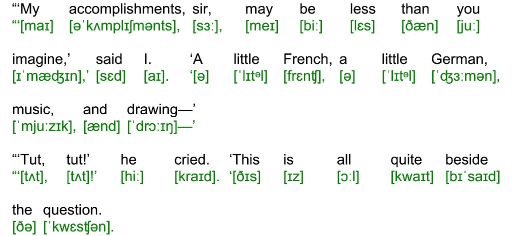 “‘My accomplishments, sir, may be less than you imagine,’ said I. ‘A little French, a little German, music, and drawing—’