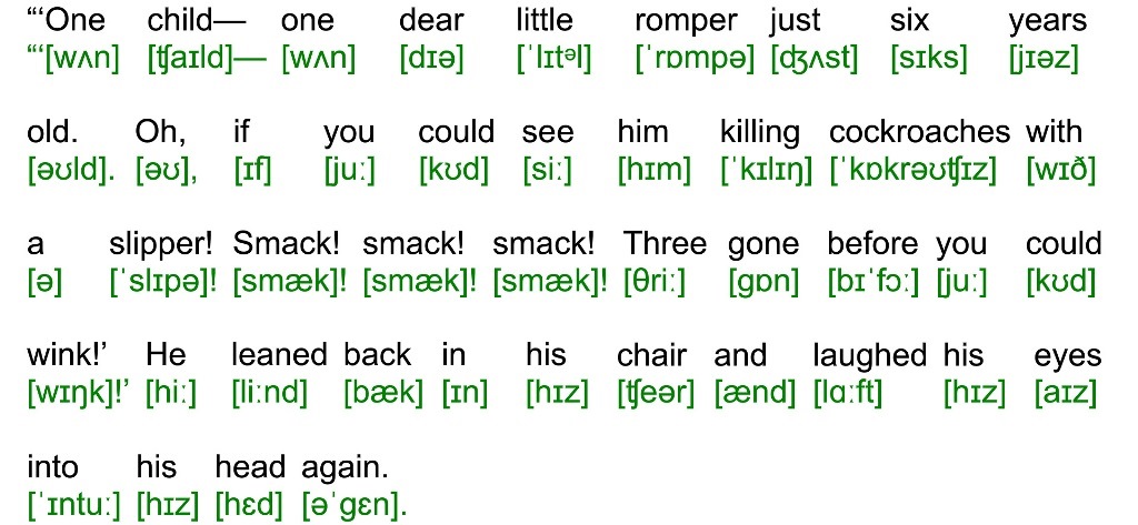 “‘One child— one dear little romper just six years old. Oh, if you could see him killing cockroaches with a slipper! Smack! smack! smack! Three gone before you could wink!’ He leaned back in his chair and laughed his eyes into his head again.