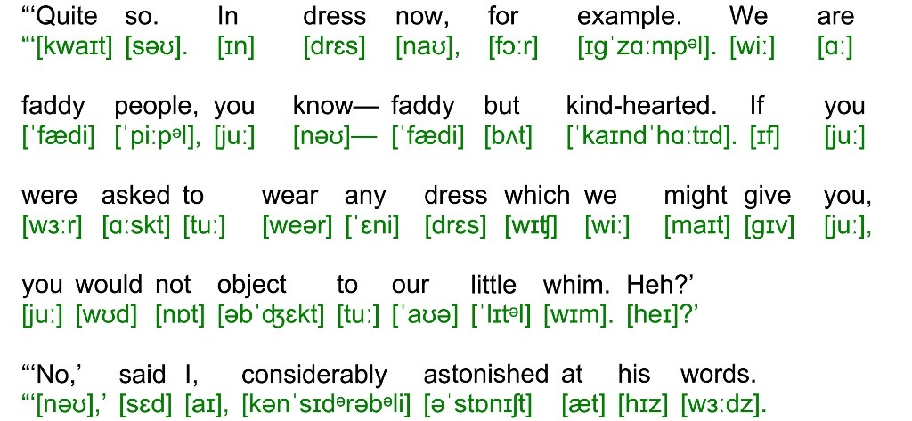 “‘Quite so. In dress now, for example. We are faddy people, you know— faddy but kind-hearted. If you were asked to wear any dress which we might give you, you would not object to our little whim. Heh?’