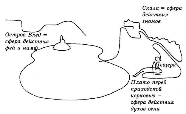 Я быстро сориентировался и попросил его объяснить мне, какую функцию имеет эта пещера внутри ландшафта Бледа. Он пояснил мне на чувственном уровне, что я должен повернуться и посмотреть вниз на плато перед приходской церковью: важна связь между пещерой и плато. Однако я не мог понять, в каком смысле. В моем сознании недоставало понятий, чтобы перевести на наш линейный язык те комплексные чувства, которые он постоянно посылал мне в качестве ответа. Поэтому я попросил его пояснить мне взаимодействие элементарных существ, с тремя сакральными зонами Бледа в их общей взаимосвязи, так как надеялся, что это мне поможет найти ответ.