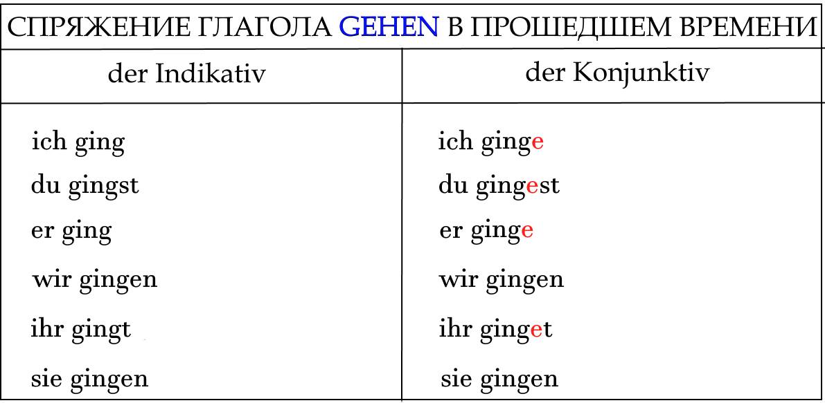 Сильные (или, иначе, неправильные) глаголы образуют Prateritum Konjunktiv от основы претеритума с помощью суффикса – е, к которому прибавляются личные окончания. Сравните: