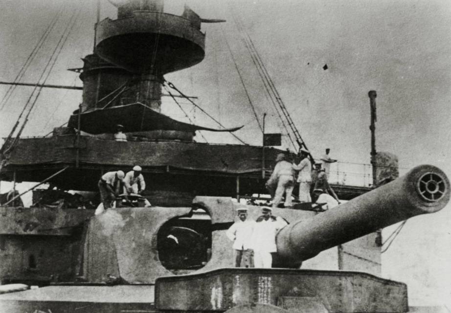 Кормовая башня «Микасы» после боя в Желтом море 10 августа 1904 года — флагманскому броненосцу вице-адмирала Хейхатиро Того крепко досталось…