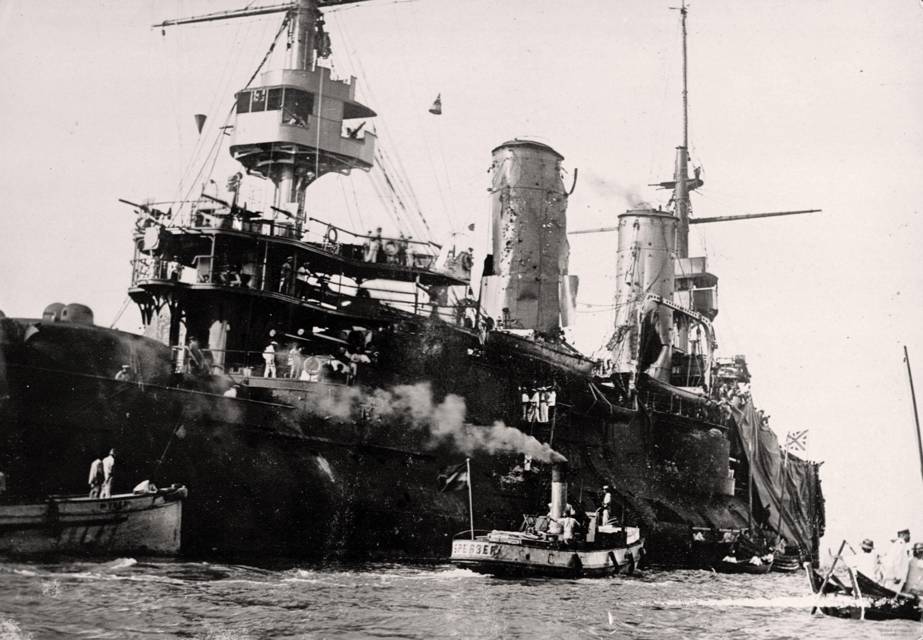 Эскадренный броненосец «Цесаревич» на следующий день после боя в Желтом море, по приходу в германский порт Циндао. Немцы сочли, что повреждения корабля не настолько серьезны, чтобы не успеть отремонтировать их за любезно предоставленные губернатором шесть суток. Но русские к работам не приступили и предпочли интернироваться и разоружиться, решив, что за них должны воевать другие. Вместе с броненосцем «дезертировали» и три миноносца, на прорыв пошел только крейсер «Новик»…