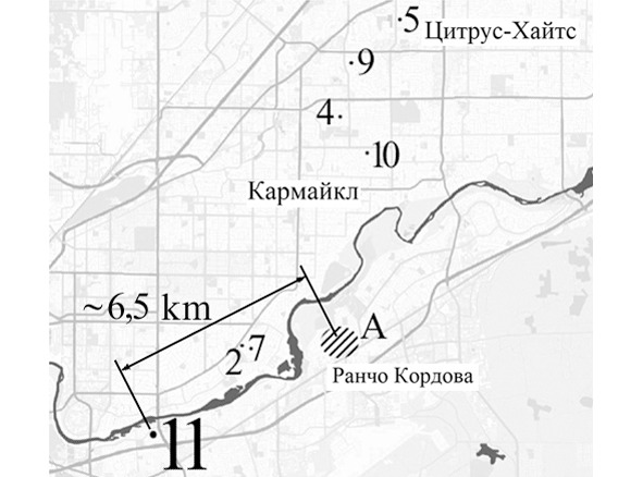 Географическая локализация мест нападений насильника из восточного Сакраменто в 1976 г. и в начале 1977 г. Условные обозначения: А — район в г. Ранчо Кордова площадью около 0,4 км.2, в котором преступник летом и осенью 1976 г. совершил 4 нападения (эпизоды 1, 3, 6 и 8); 2, 4,5, 7, 9 и 10 — места нападений в различных частях городов Кармайкл и Цитрус-Хайтс в их хронологической последовательности; 11 — место нападения насильника в восточной части г. Сакраменто в ночь на 19 января 1977 г. Преступник, ощущая рост напряженности в районах своей активности, решил выйти за рамки своего «ареала» и появился там, где никто из местных жителей его не ждал.