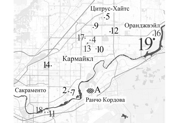 Географическая локализация нападений насильника из восточного Сакраменто с июня 1976 г. по май 1977 г. Числа указывают очередность преступных посягательств, штрихованная область А обозначает район в г. Ранчо Кордова, в котором на площади менее 0,5 км2 имели место пять нападений (1, 3, 6, 8 и 15 в порядковой последовательности). Хронологически последнее нападение, 19-е по счёту, произошедшее в ночь на 5 мая, имело место на удалении около 1,2 км. от нападения 2 апреля (эпизод №16).