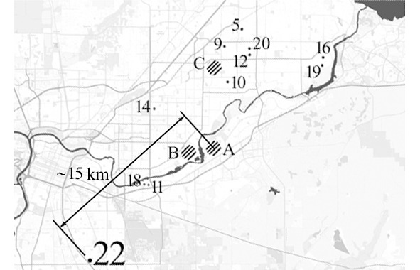 Географическая локализация нападений насильника из восточного Сакраменто в период с июня 1976 г. до конца мая 1977 г. Выделенные штриховкой области соответствуют участкам с наивысшей плотностью посягательств этого преступника: А — в г. Ранчо Кордова (эпизоды 1,3,6,8 и 15 в хронологической последовательности), В — в г. Кармайкл (эпизоды 2,7, 21) и С — также в г. Кармайкл, в северной его части (эпизоды 4,13,17). Бросается в глаза, что нападение в ночь с 27 на 28 мая 1977 г. в южной части г. Сакраменто оказалось территориально наиболее отдаленным от эпицентра активности, связанной с областью А. Вряд ли можно сомневаться в том, что преступник, проводя разведку в столь отдаленном районе и принимая решение о нападении, должен был руководствоваться очень серьёзным мотивом. Возможно, самым серьёзным из всех, что управляли его действиями на протяжении всего предшествующего года.