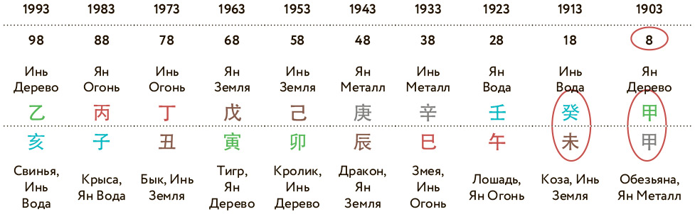Периоды в карте Есенина.Перед нами карта, рожденная в год Инь, а значит, Столпы удачи мы будем выстраивать движением назад по 60 Цзя Цзы, начиная с периода??. Перед этим столпом стоит столп??, а за ним – столп??и т. д., до 10 столпов по десять лет. Кроме того, нам нужно рассчитать год начала периодов удачи: для этого от даты рождения 03.10 необходимо сосчитать количество дней до начала китайского месяца, в котором человек родился. Месяц Петуха в 1895 году начался 08.09, а значит, между этими днями 25 дней. Разделив полученный результат на 3, получим значение, равное 8,3(3). Используем целое значение и начало первого десятилетнего периода удачи считаем равным 8 годам. См. обозначения на карте ниже.