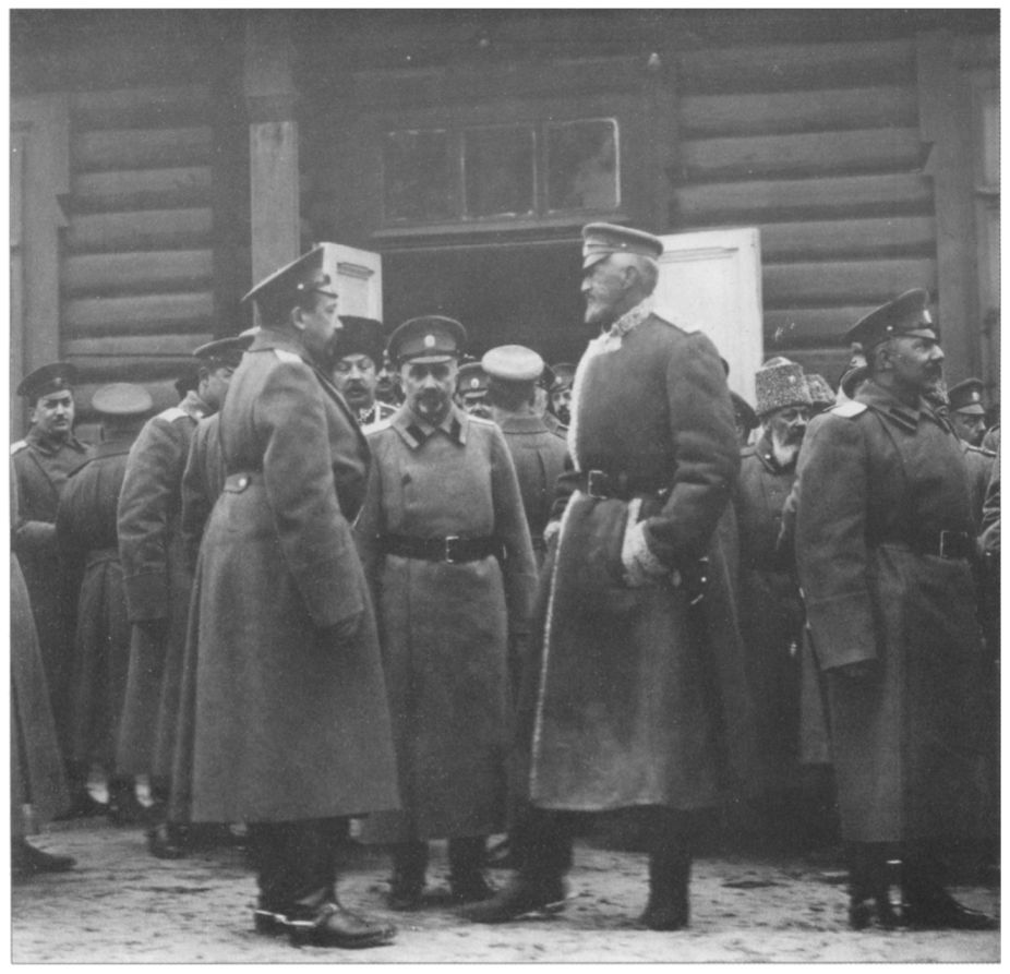 Офицеры и генералы Ставки Верховного главнокомандующего у входа в походную церковь. На переднем плане слева направо: Начальник штаба генерал Н.Н. Янушкевич, генерал-квартирмейстер Ю.Н. Данилов и Великий князь Николай Николаевич.