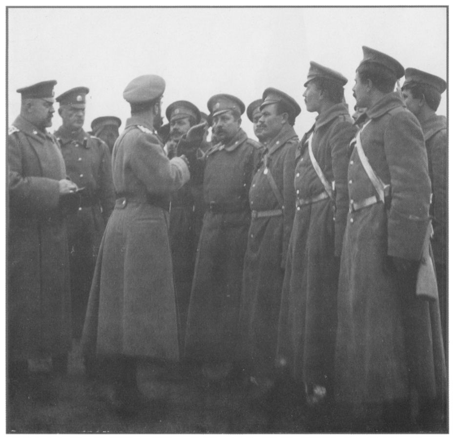 Император Николай II знакомится с отличившимися в боях солдатами.