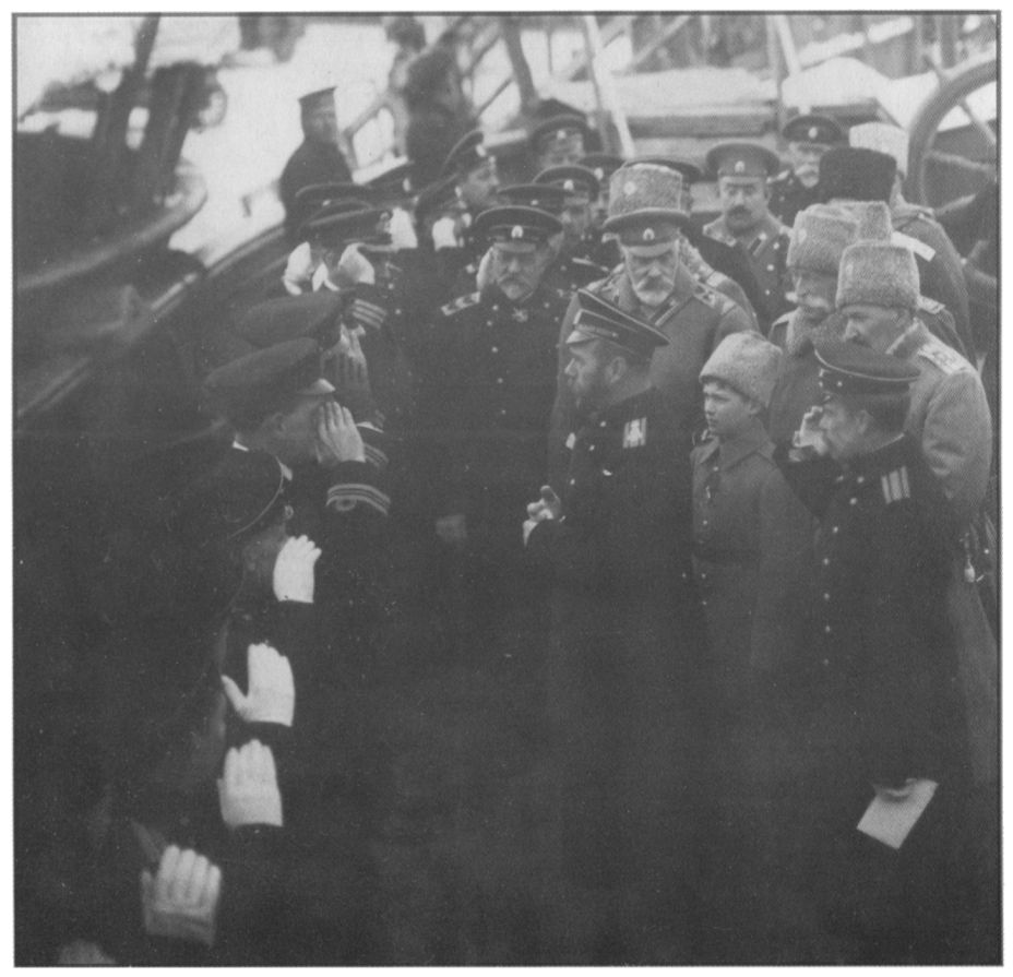 Император Николай II и Цесаревич Алексий Николаевич на церемонии награждения русских и английских подводников.